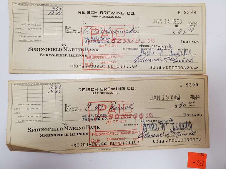 LOT 222 - Pair of Check From Reisch Brewing Co. 1963