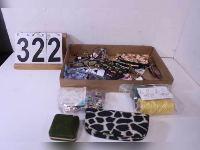 LOT 322 - Flat W/ Reading Glasses - Glass Cases - Bobbins -Waxed hemp