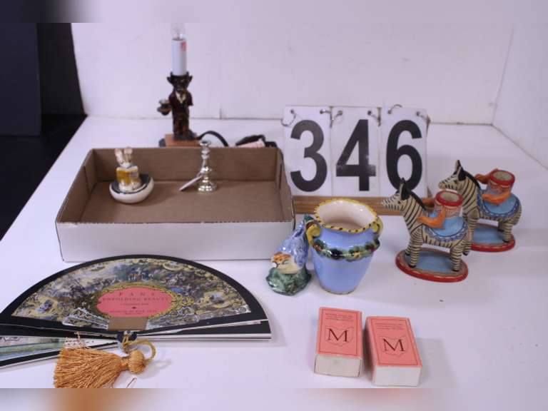 LOT 346 - Flat W/ Pair Donkey Candle Holders - Vase - Bird - Other Items