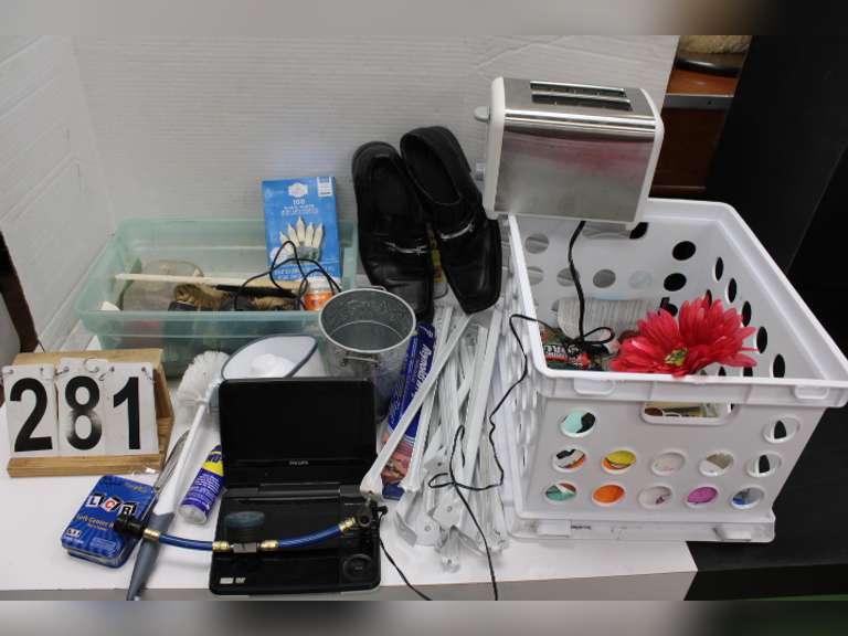 LOT 281 - White Crate W/ Toaster ~ Portable DVD Player ~ Shelf Brackets ~ Shoes Size 9.5 ~