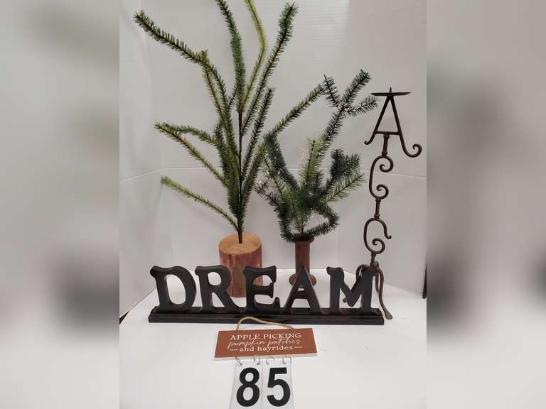 LOT 85 - Lg Clear Tote w/ Dream Sign ~ Wrought Iron Candle Stick & Artificial Trees