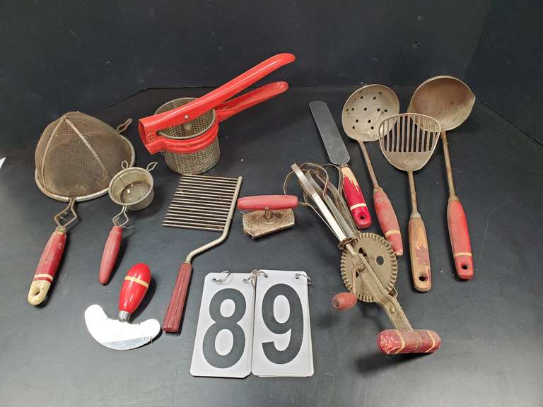 LOT 89 - Flat of VTG Red Wood Handled Utensils w/ Potato Press ~ Egg Beater & Angel Food Cake Cutter Comb