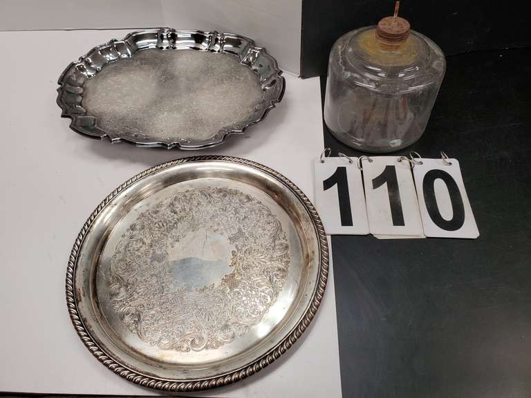 LOT 110 - Clear Tote of Silver Plated Platters & VTG 9" Drip Feed Glass Bottle Jug Kerosene Stove From 1913