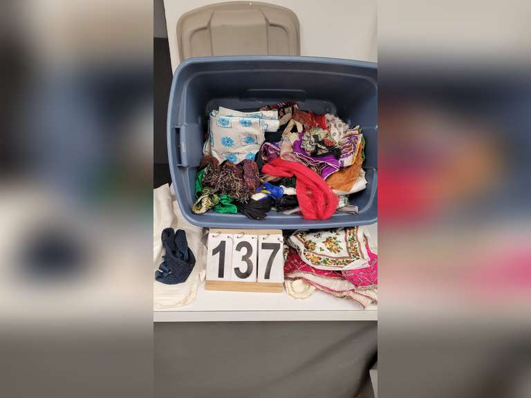 LOT 137 - Blue Tote W/ Lid W/ Head Scarves -
