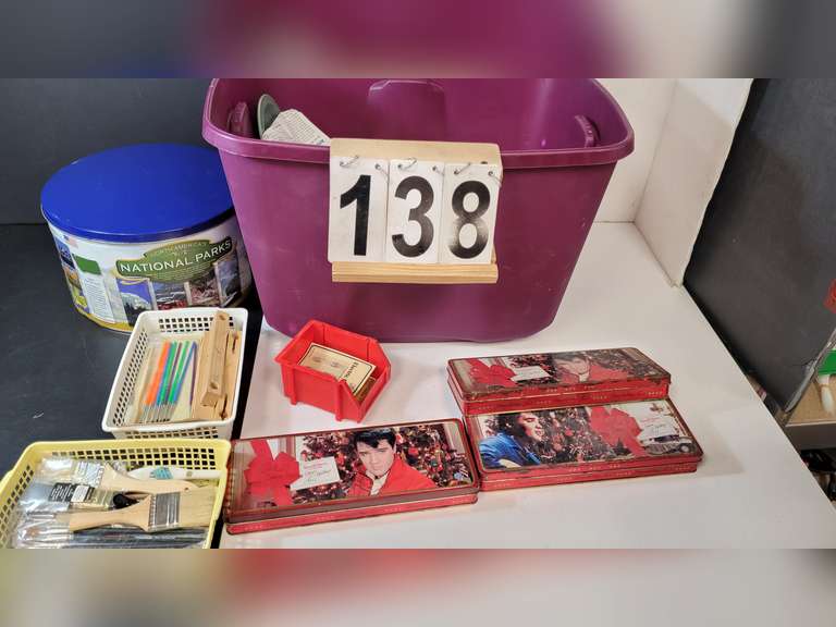 LOT 138 - Purple Tote W/ Lid W/ Paint Brushes - Tins