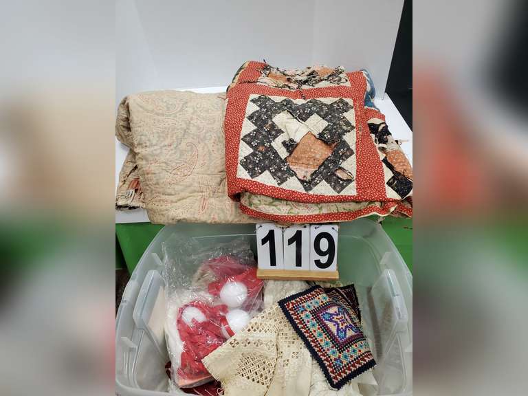 LOT 119 - Lg Clear Tote of Quilts That Needs Finished & Other Craft Items