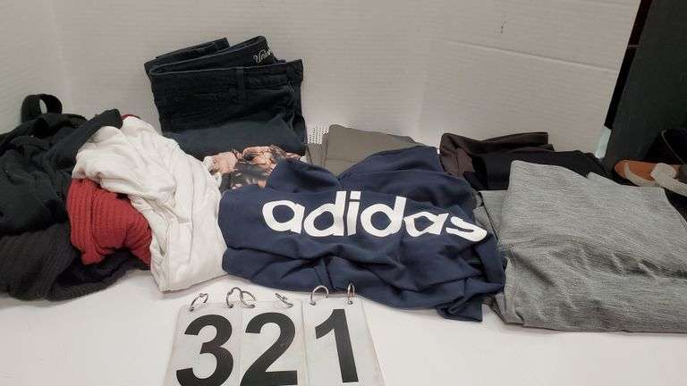 LOT 321 - Box of Women's Clothes Includes Sweaters ~ Dresses ~ Jackets & Yoga Pants (All Size L- XL)