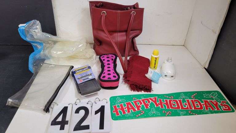 LOT 421 - Red Leather Bag - Storage Bag - Dog Toy - Shopping Cart Cover - Febreze Air Freshener - Holiday Sign